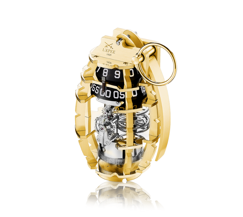 Grenade is modelled after the historical MKII grenade with an M6A4C fuse that uses a pin that is pulled to activate the explosive. In a similar way, the L’Epée 1839 Grenade features a pin that doubles as the key, which when pulled allows for setting the time and winding the eight-day movement. The moment you pull the pin on a grenade the mind is focused: the grenade is live, and you must concentrate on the here and now to survive.
