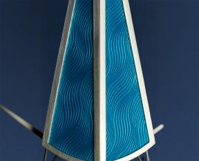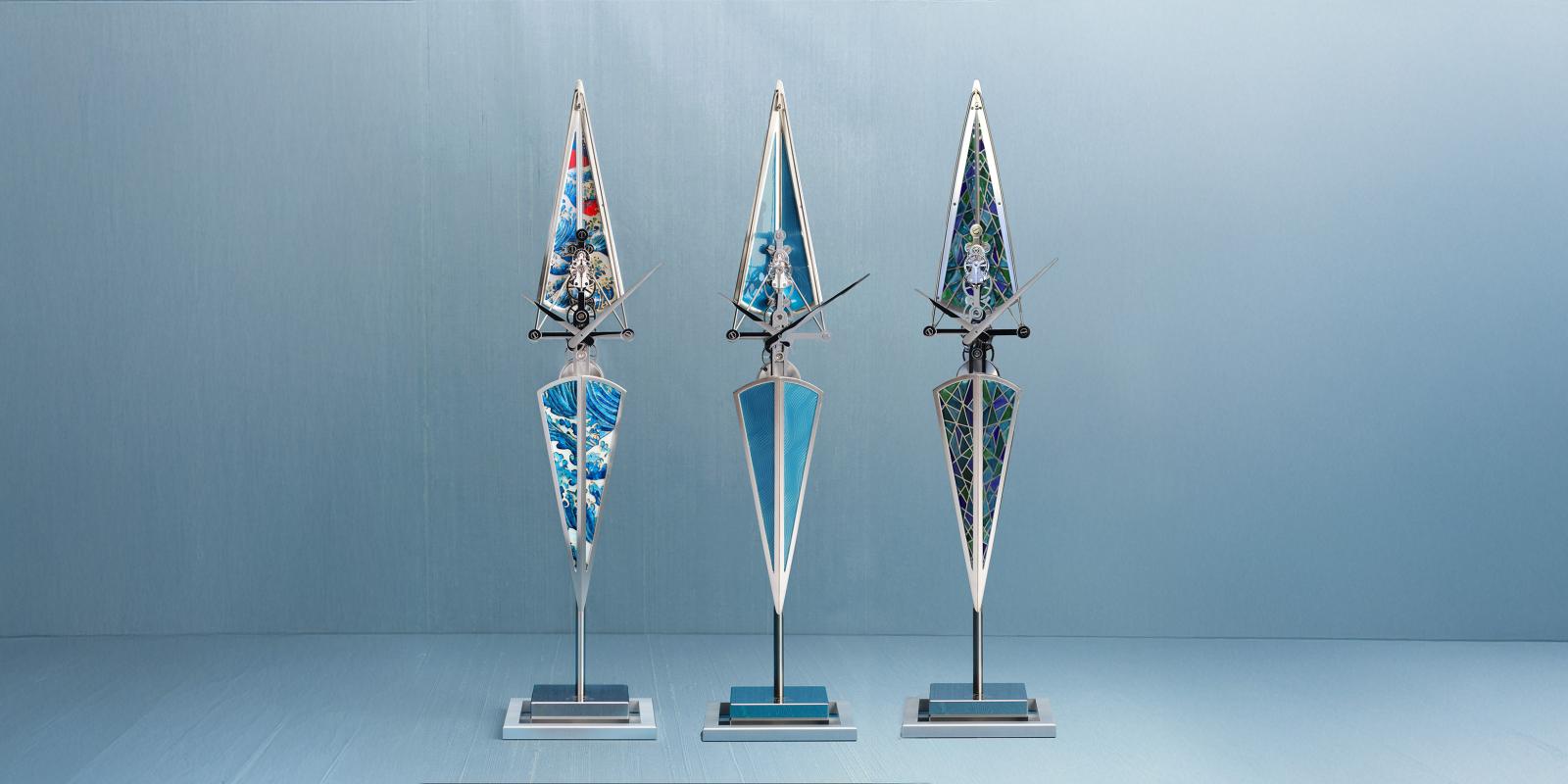 In this interpretation of La Regatta, prism pattern introduces a dynamic, almost mosaic-like rhythm that contrasts with the clock’s pure, vertical architecture. Applied using the plique-à-jour enameling technique, the interplay of deep blues and greens evokes shifting reflections on water, while the structured geometry echoes both the precision of the sport and the rigour of mechanical engineering. The technique adds a vibrant, expressive dimension to the piece, while preserving its inherent sense of balance and discipline.
