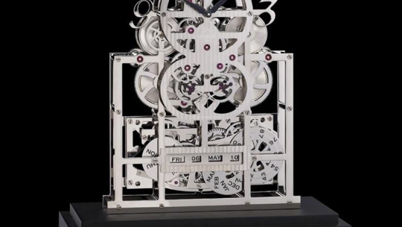This resolutely contemporary collection brings together tradition and fine watchmaking know-how. At the very top of this creation is the double retrograde seconds showcasing two crossed swords. At the opposite end is a linear perpetual calendar that proudly displays the day, date, month and year on a single line. Next the eye comes to rest on the five-barrel movement and its fascinating dance of wheels – all magnificently finished and entirely visible thanks to the skeletonized plates – followed by the two more solemn power reserve hands.