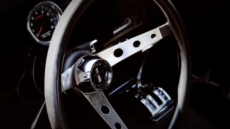 The three-spoke steering wheel is assembled just as the original steering wheels were, with a center rim and two outer rims held together by 12 rivets. The steering wheel is turned counterclockwise to set the time, while turning clockwise allows repositioning of the wheel to center.